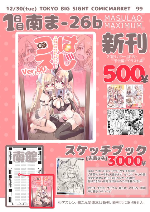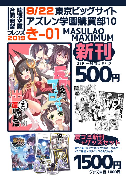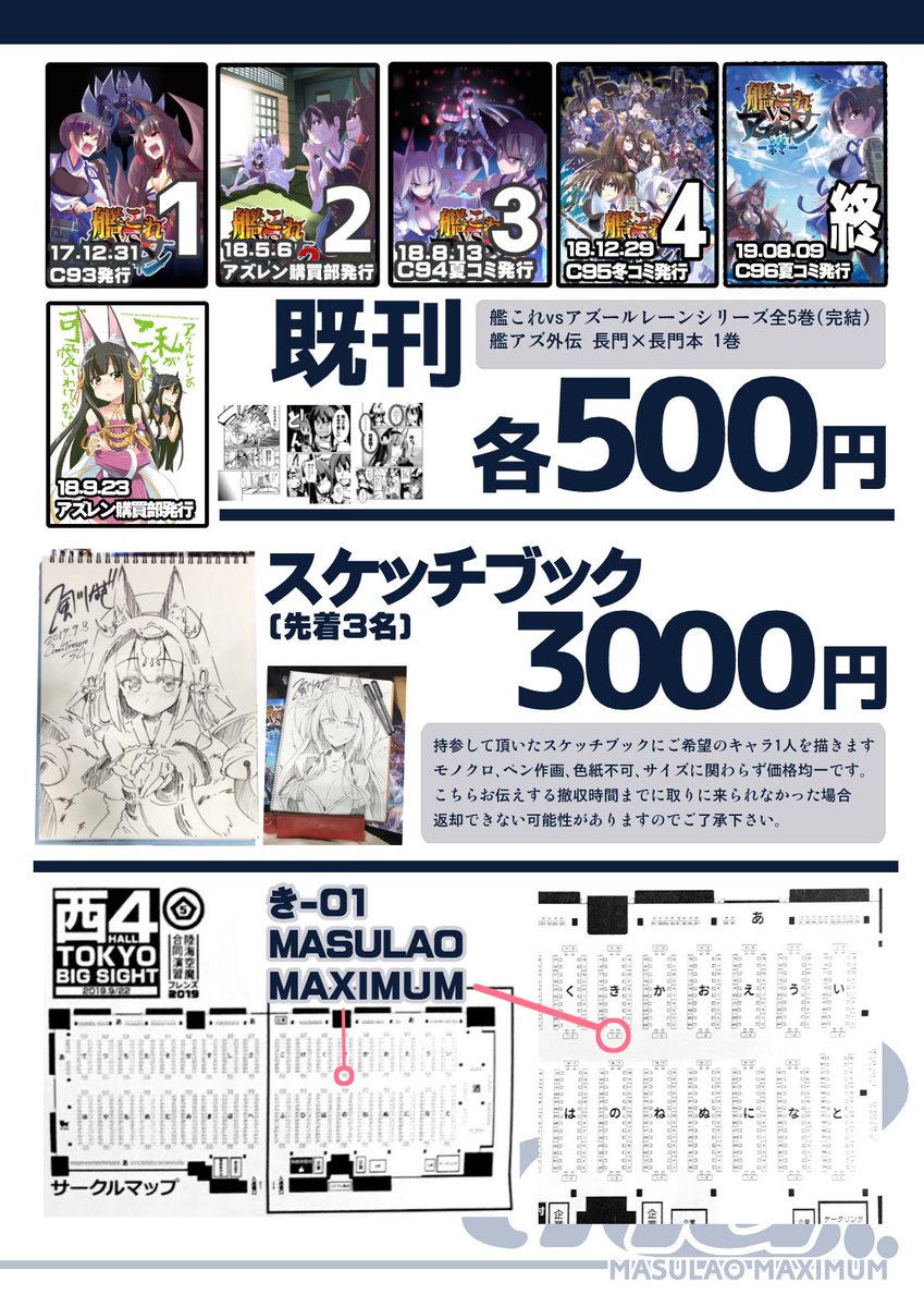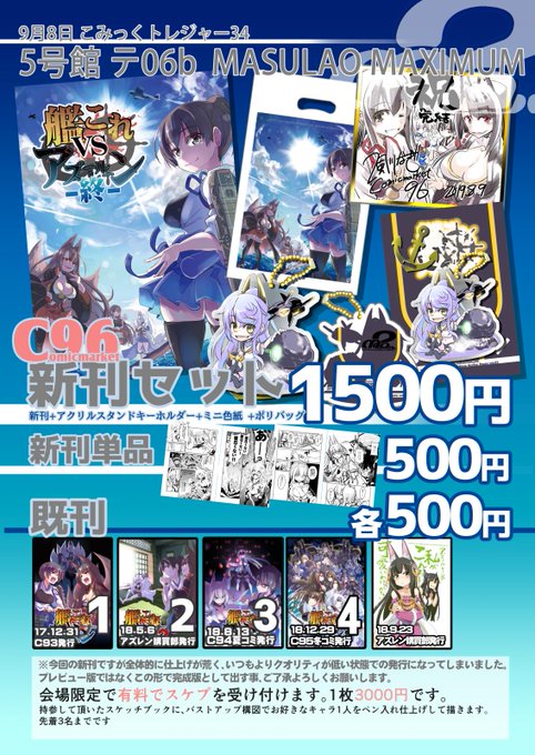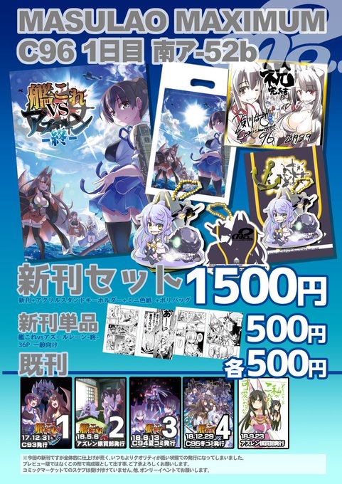 C96 1日目 南ア-52b MASULAO MAXIMUM お品書き 新刊艦これvsアズールレーン-終- と新刊グッズセット、シリーズ全既刊。よろしくお願いします! WEBカタログ:webcatalog-free.circle.ms/Circle/14505443
