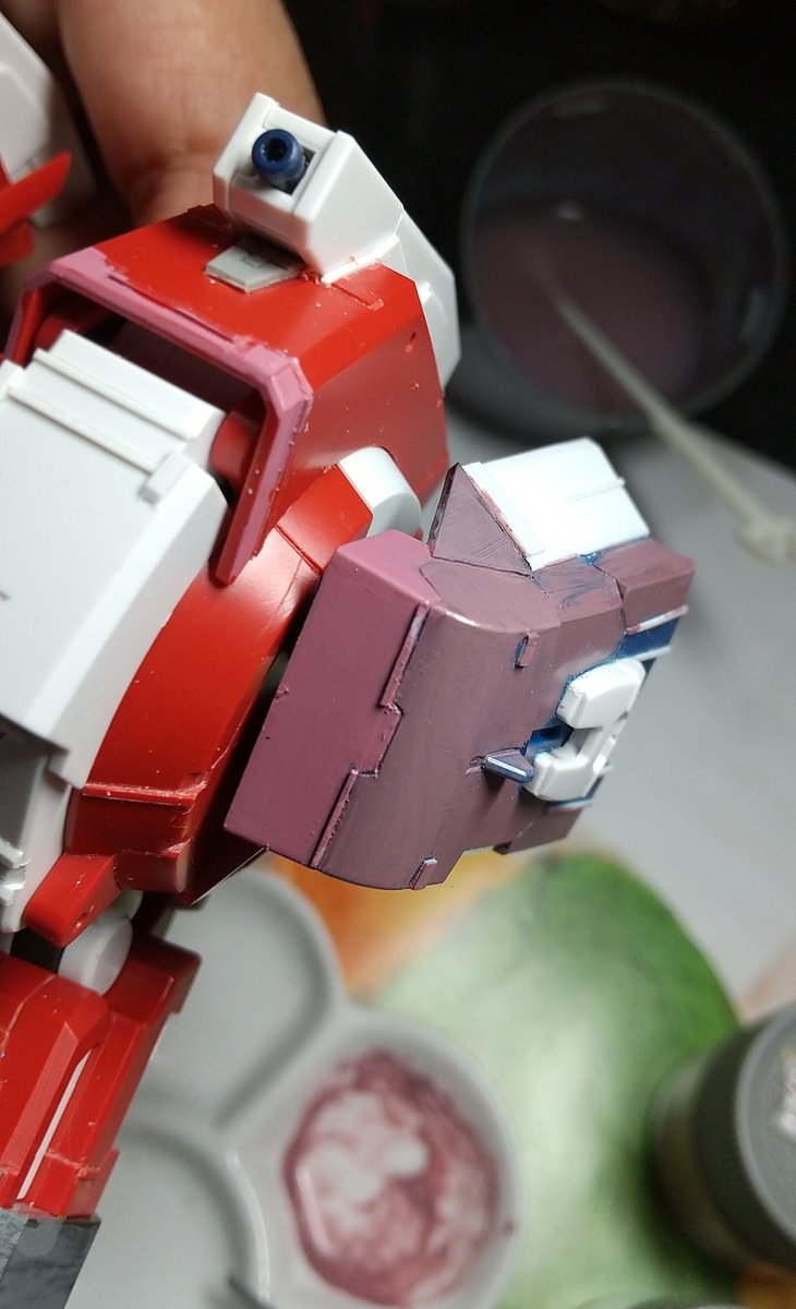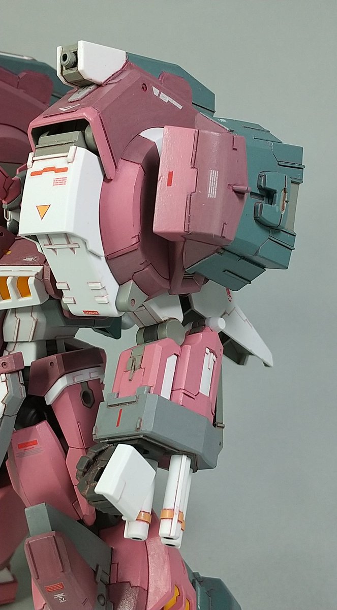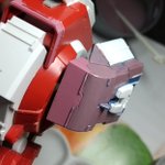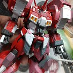 塗装始めました(’-’*) 結局アルトアイゼンとして仕上げることにして、赤に塗っていきます。 基本色を変な赤(ピンク)にしたら違和感が凄くて困ってたのですが、黒のところを薄めのグレーにしてみたらなんとなくいけそうな感じにw 例によって組んだ状態のまま、塗り分けを検討しながら塗り進めます(‘ε‘ )