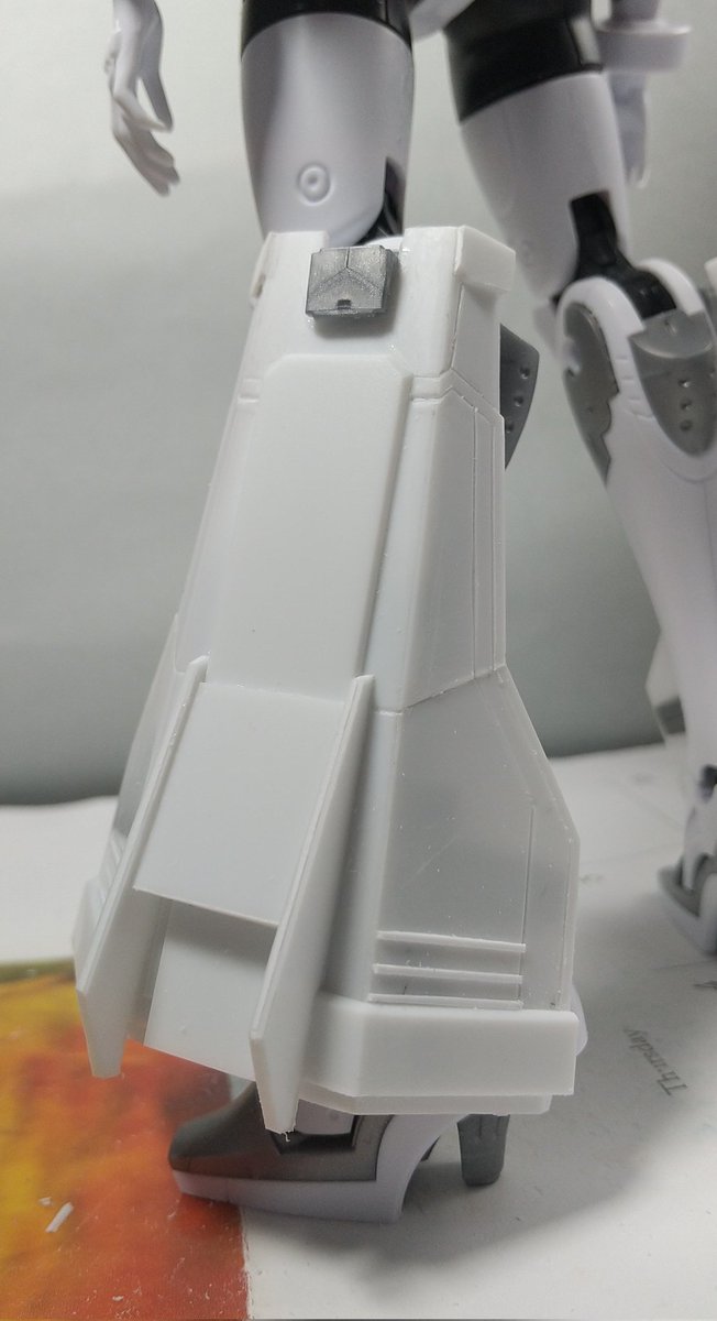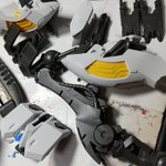 では実際にパーツ流用製作開始です♪ 脚部部は最初の想定通りほとんど無加工で流用パーツを接着(一部干渉部分は削ってますが)。 肩アーマーはボリュームを求めて2パーツの組み合わせを改めて検討します(=д= )