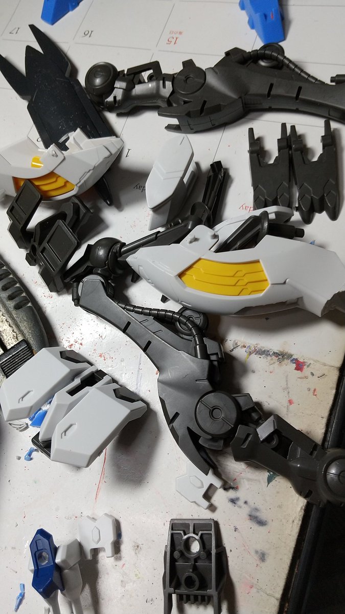 キットは可動もプロポーションも問題ないので、本体部には手をつけずに流用パーツでお手軽にデコレートしていく作戦でいけそうです~♪ 何気なくジャンクをあさったら鉄血のキットを中心にまとめた山だったので、その中から適当にパーツをチョイスしてイメージを模索していきます(‘∀‘ )