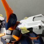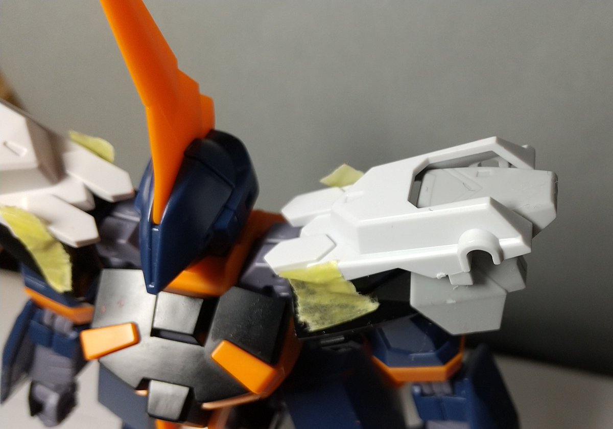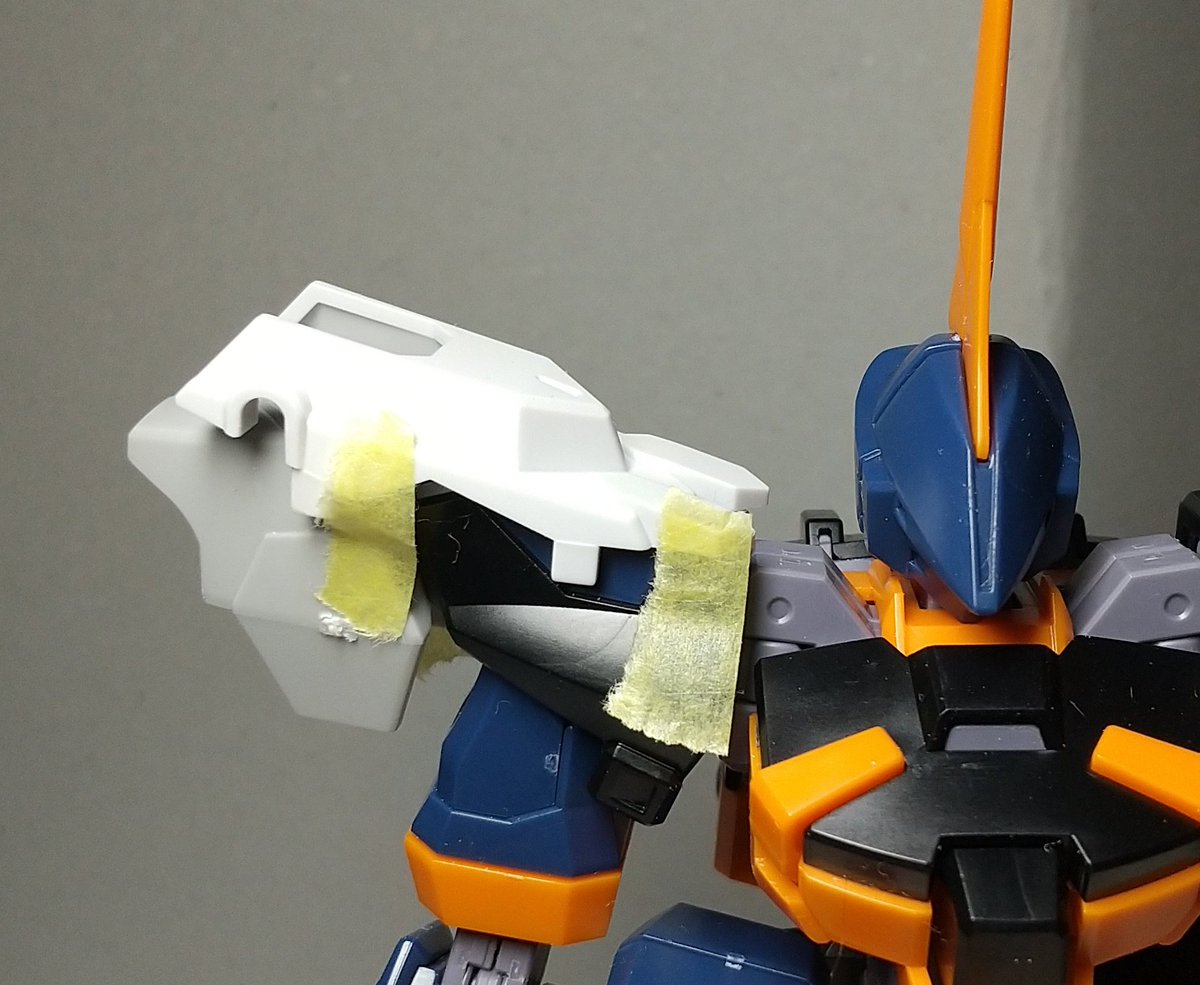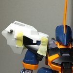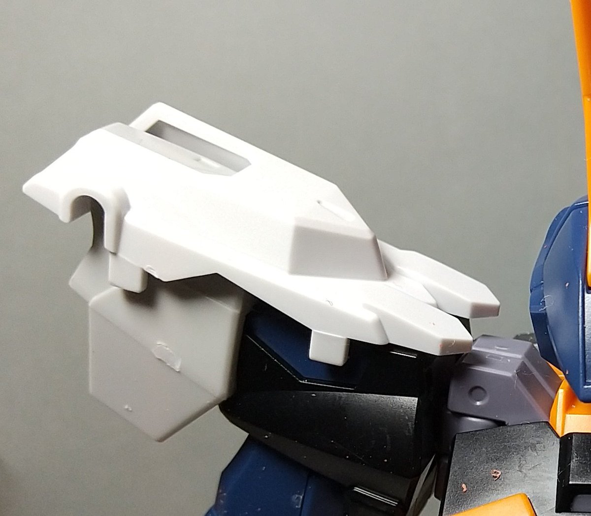 肩アーマーを実際に接着したら、さらにパーツ盛りを検討。 背面バックパックの上部に乗せてみてるパーツは、鉄血のじゃなくてAGE1の太ももですw