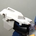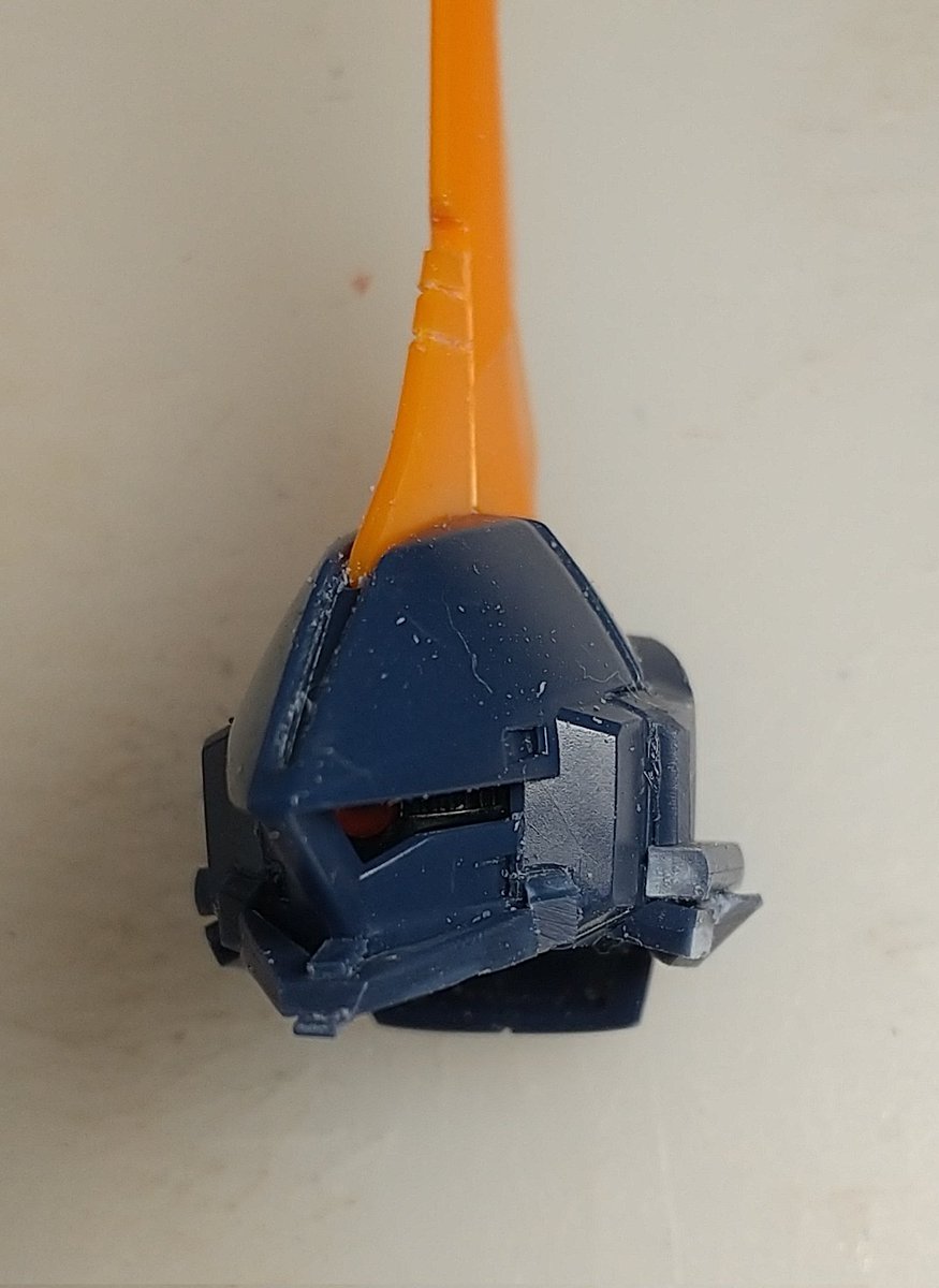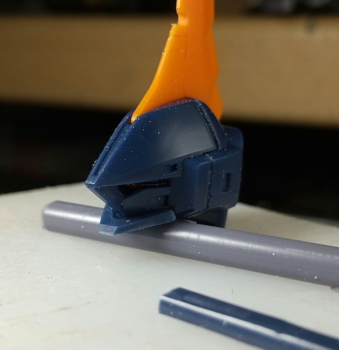 頭部は元々のイケメンをさらにカッコ良くする方向でランナープラ板を貼っていきます。 まずはあご部分にV字に加工したプラ板をセット(これだけで印象がだいぶ変わります)♪ その後側面にも細かく貼り足して頭部自体を大型化。ツノは余剰タグ部を活かしながらメリハリを付けて切り欠きました( `¯ ω¯´)