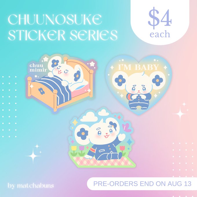 [ PRE-ORDERS OPEN ] Show off your love for Chuunosuke with these stickers! Each sticker includes unique holographic and glitter details that’ll catch anyone’s attention! ORDER NOW: matchabun.bigcartel.com Pre-orders end on Aug 13, 5PM PDT RTs/🔁 are appreciated!