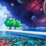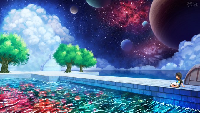 『宇宙と海と雲が導く旅』 どこまでも広がる宇宙と海… 雲に導かれ不思議な世界を旅する… そういう世界観の絵を描いてみました。PC用壁紙にどうぞ~ #壁紙 #宇宙 #背景 #風景 #絵描きさんと繫がりたい #イラスト好きさんと繋がりたい
