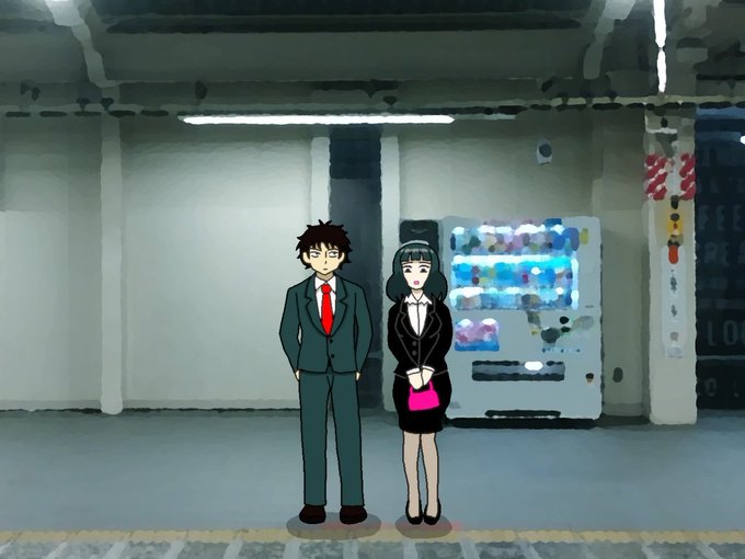#きのこパニック #アニメ 夜、駅のホームに並ぶ2人を描きました。