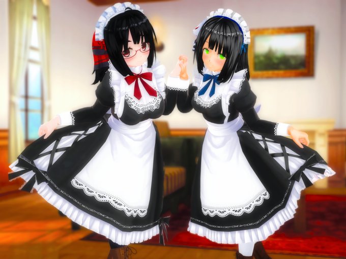 さあ今年もやってまいりました #メイドの日 今年は九(@ iti_ziku148)さんちの小雨ちゃんをお招きいたしましてうちのアリサとお揃いのメイド服でぱしゃり。 #メイドの日2023 #COM3D2