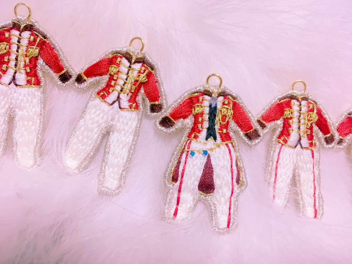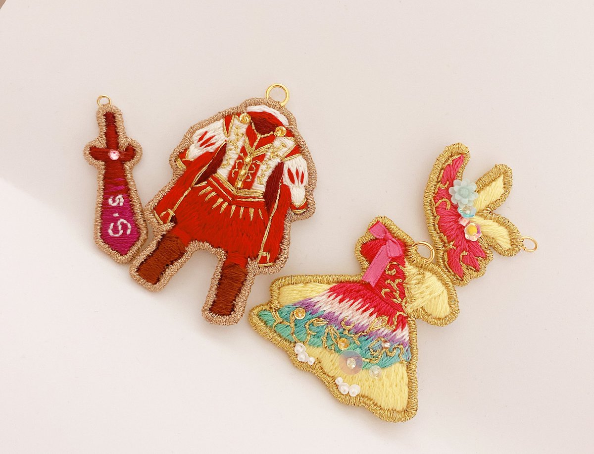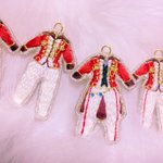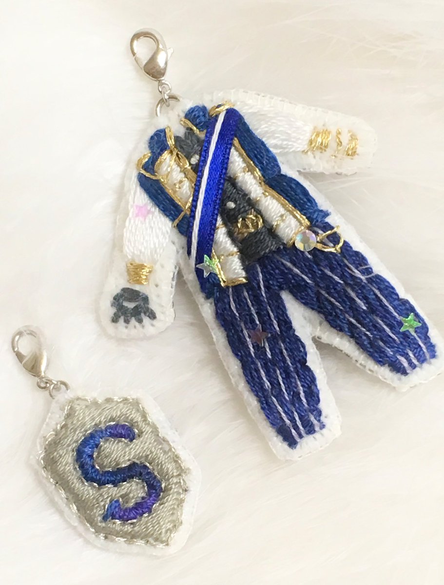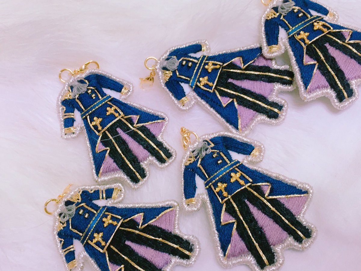 お品書き③ 刺繍衣装チャーム【ましろ姫・騎士】 刺繍チャーム(衣装と帽子・リボン)とファーは取り外し可能です。 騎士には一輪の薔薇、姫にはパールの薔薇パーツが付属します🌹 薔薇十字は渉もいます…! 後日画像上げます!