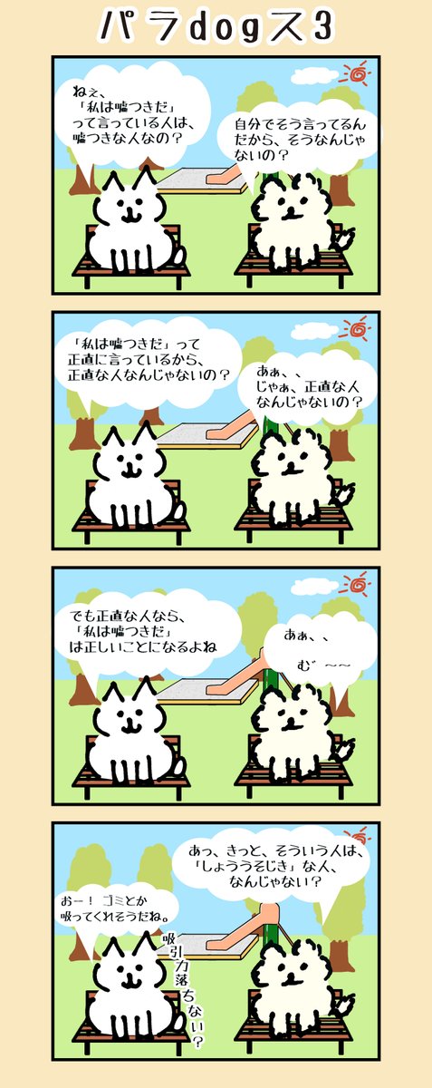 2 10 ねこみたいないぬ 四コマ漫画 「パラdogス3」 #ねこみたいないぬ #いぬ #ねこ #四コマ #四コマ漫画 #マンガ #漫画 #パラドックス #パラドクス #会話 #漫画が読めるハッシュタグ #正直 #嘘つき 21/05/28 02:10