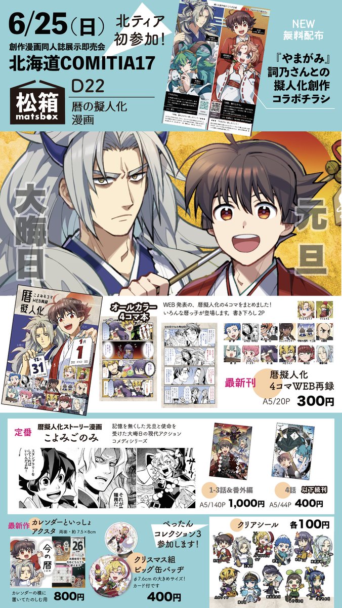 北海道コミティア17 お品書き(画像1枚) 🗓6月25日(日) 札幌コンベンションセンター(北海道) 📍D22 松箱・暦の擬人化 定番の既刊やグッズ・ペーパーなど。 全年齡対象作品です! 新作は擬人化創作コラボチラシ、シール作品有で #ぺたコレ 参加します。 🛒matsboxxx.booth.pm #北ティア