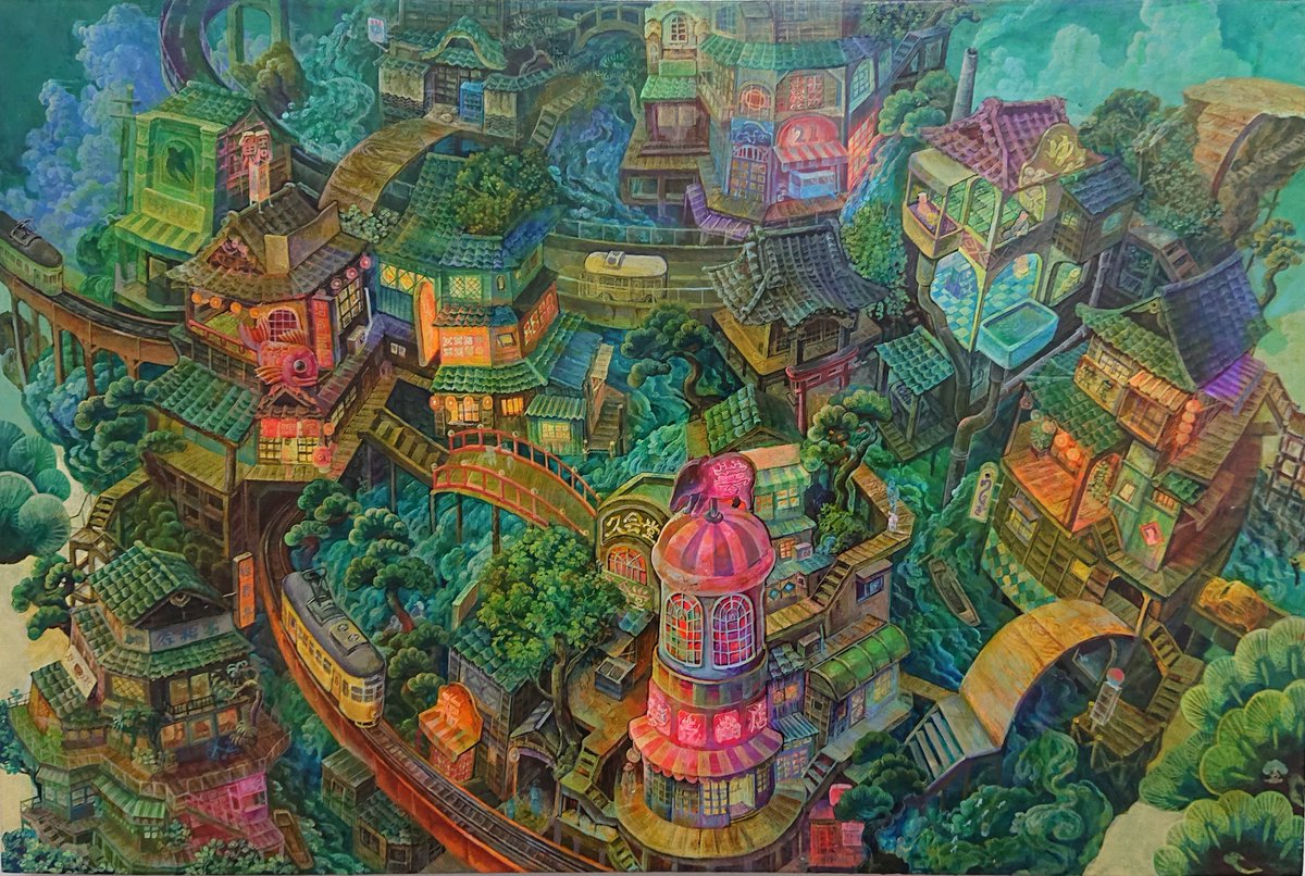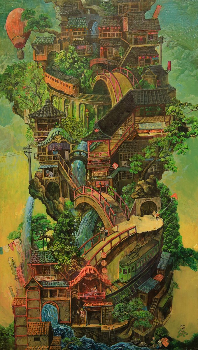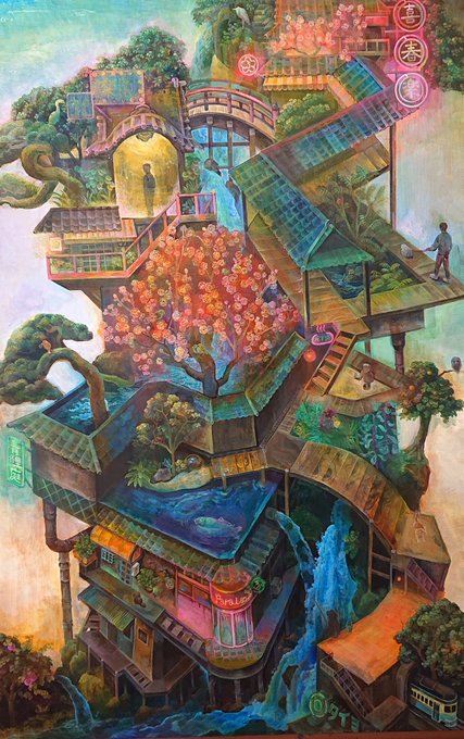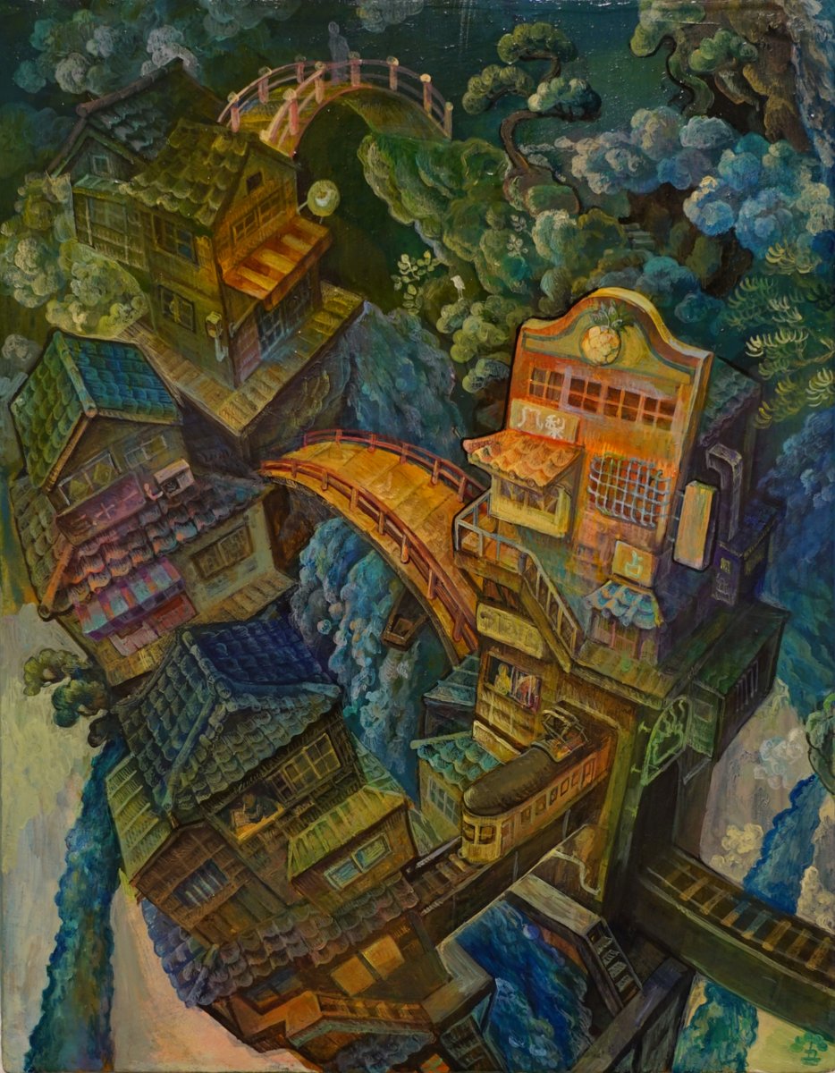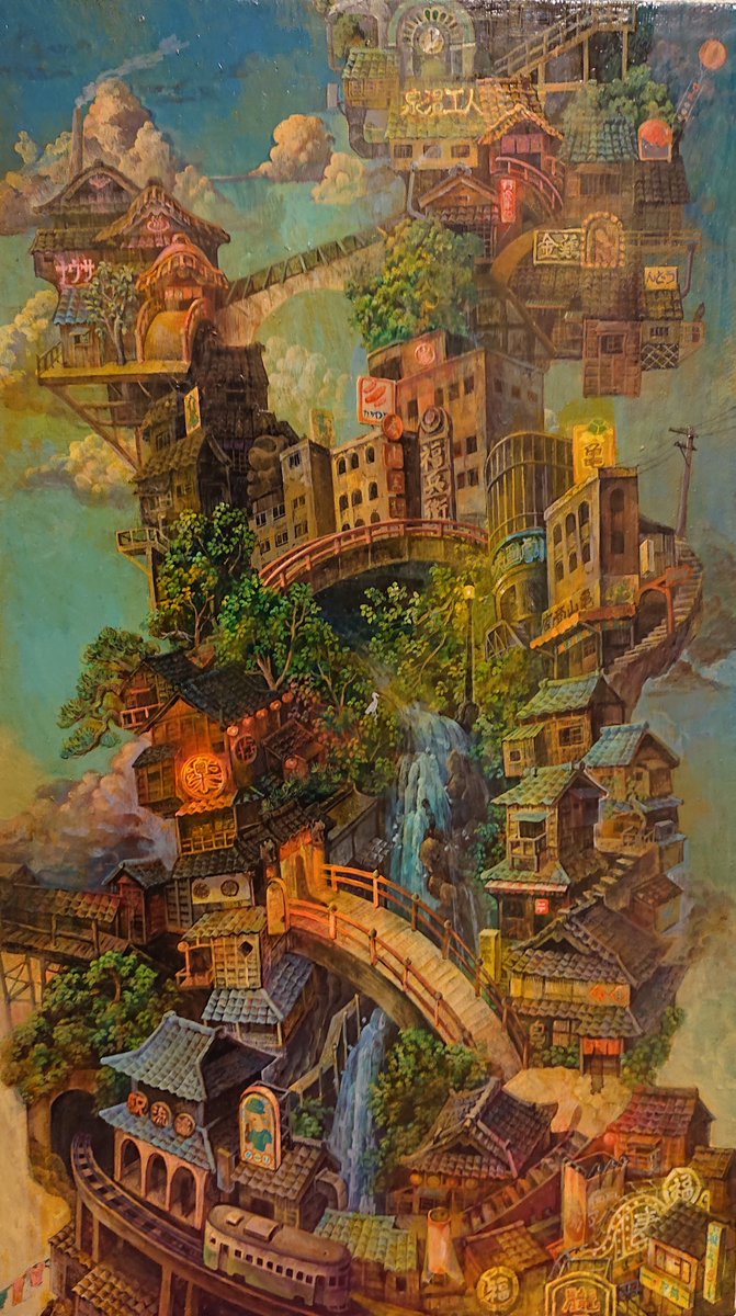 #これを見た人はアオリ絵を貼る見た人もやる #これを見た人は俯瞰絵を貼る見た人もやる 「滝降り街」アオリと俯瞰両方ある多視点の絵です😉GalleryTK2さんに展示して頂いてます。