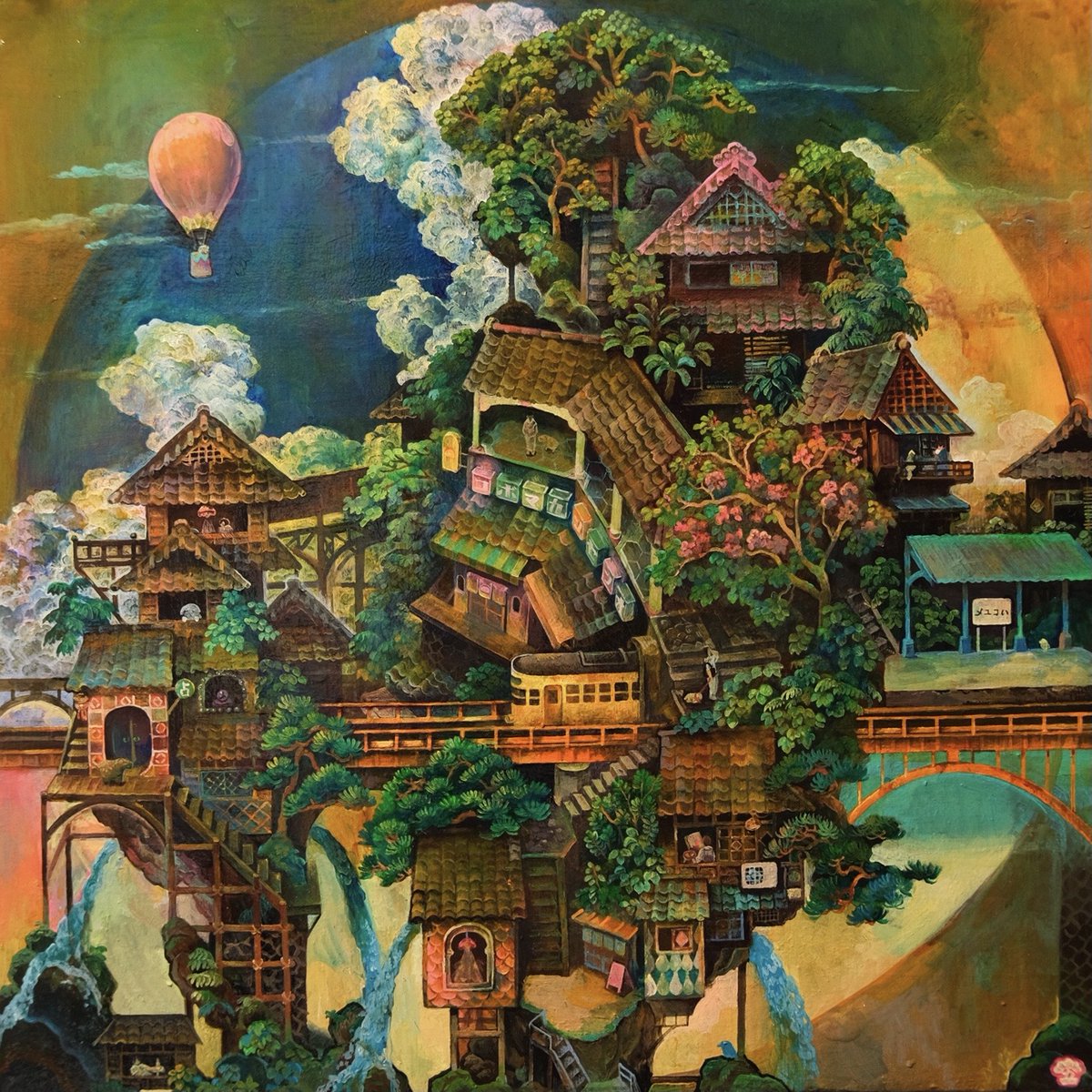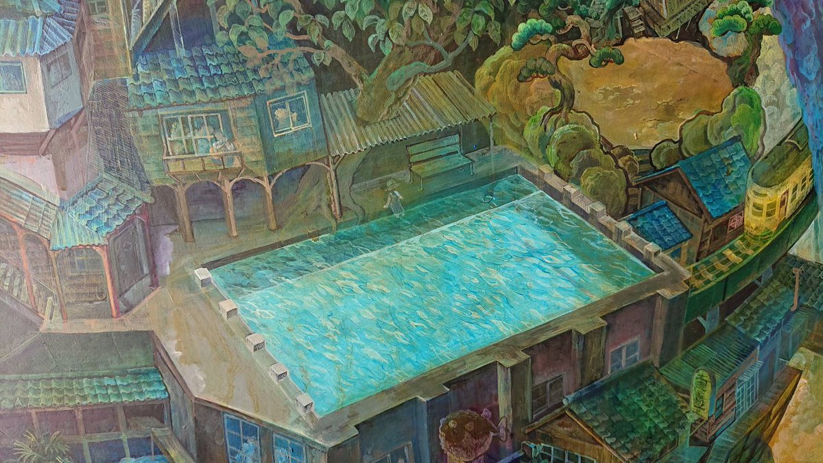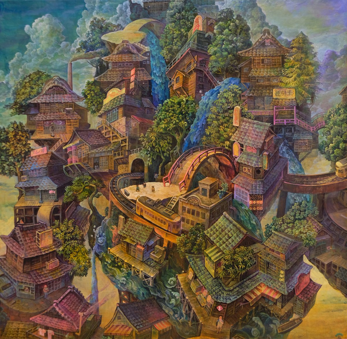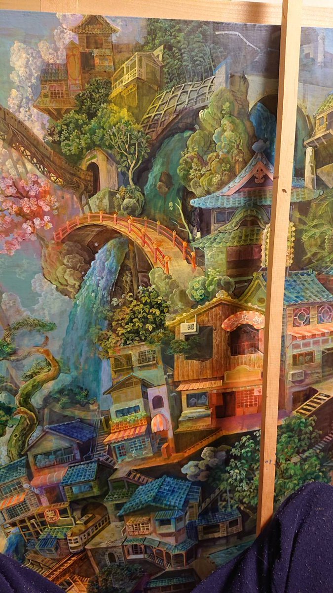 #これを見た人はアオリ絵を貼る見た人もやる #これを見た人は俯瞰絵を貼る見た人もやる 「滝降り街」アオリと俯瞰両方ある多視点の絵です😉GalleryTK2さんに展示して頂いてます。