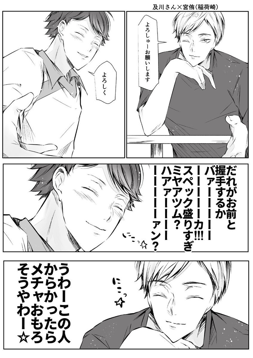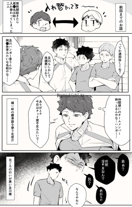920 6079 マシュマロで「部内で入れ替わっちゃったパロを青葉と稲荷崎で」とリク貰ったのですが、 及川さんと北さんが入れ替わっちゃったパロで‥🙏🙏 20/02/16 08:06