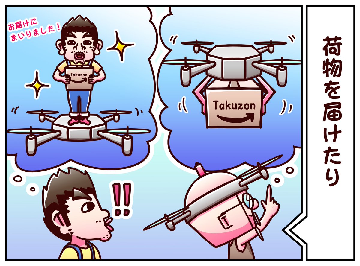 🚧第3話『ドローンにおまかせ!』🚧 2ページ、2コマ目。 「ドローンで荷物をお届け」 #冬の創作クラスターフォロー祭り #イラスト #漫画 #マンガ #落書き #絵描きさんと繋がりたい #漫画が読めるハッシュタグ #漫画好きな人と繋がりたい