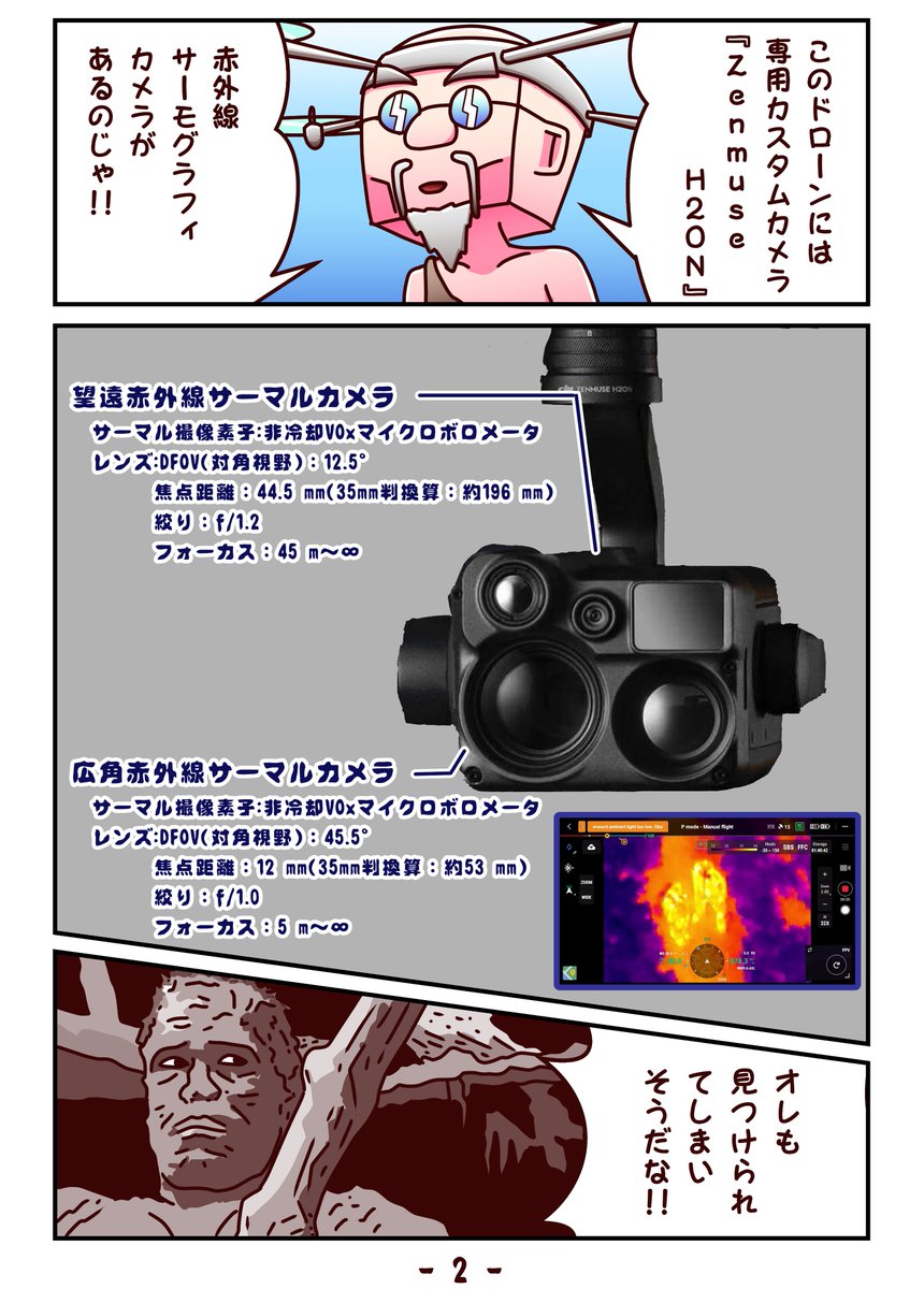 🌻第4話『たっくん高性能ドローンをゲット』🌻 2ページ目、全コマ。 ドローン仙人:赤外線サーモグラフィカメラがあるのじゃ! #冬の創作クラスターフォロー祭り #イラスト #漫画 #マンガ #落書き #絵描きさんと繋がりたい #漫画が読めるハッシュタグ #漫画好きな人と繋がりたい