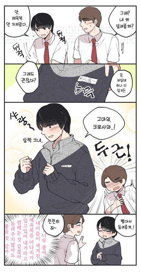 오므라이스님이랑 썰풀다 나온 아다치 체육복 빌려주는 쿠로사와😇 한편으로는 체육복 돌려받고 밀봉해놨다는 말도..🤔