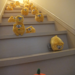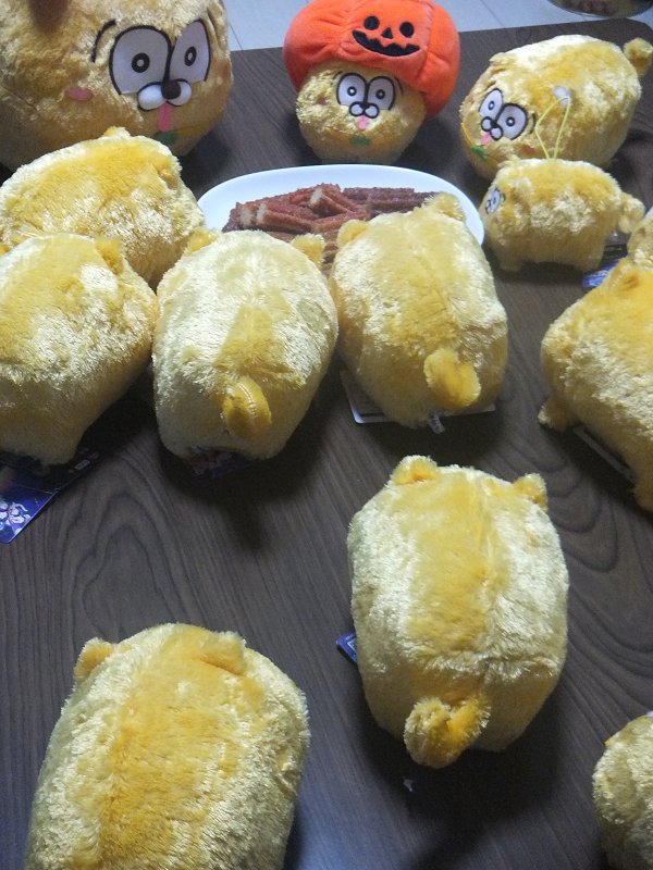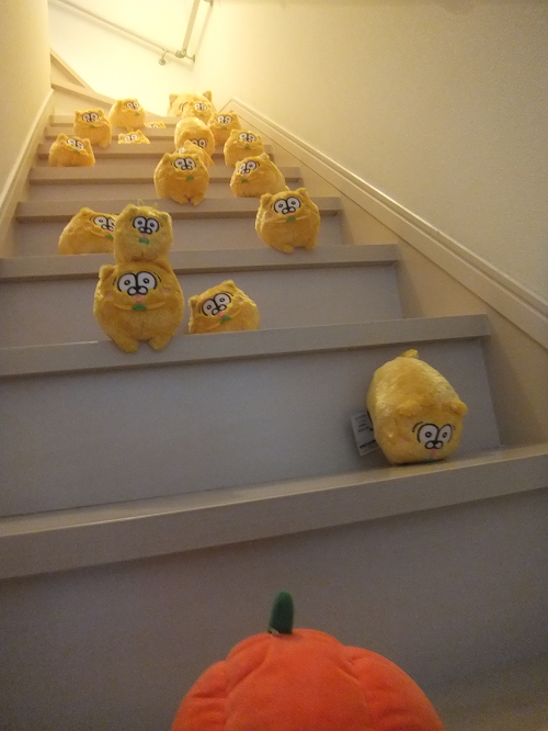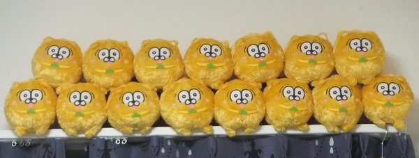 13 36 【#5男黄色い毛玉】 普段中サイズはここに飾ってる。最初ピラミッド型に積んで朝カーテン開けたらそのまま頭上に黄色い毛玉のもふもふ攻撃をうけました!ありがとうございます!でも結構痛いよ!! 18/11/20 21:25