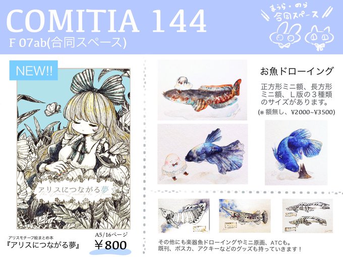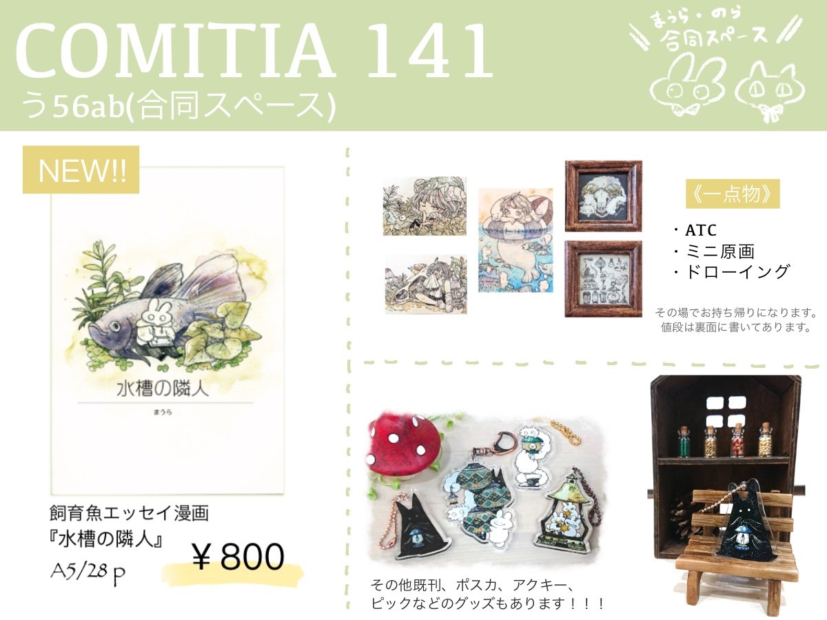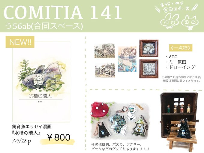 【お品書き】 新刊「水槽の隣人」 飼育している魚たちとのエッセイ漫画です🐟️🌿 今までの既刊、ミニ原画、ポスカやアクキーなどのグッズもあります📚️ 今回ものらさんと合同スペースです。「う56ab」でお待ちしております〜!! #COMITIA141 #コミティア141