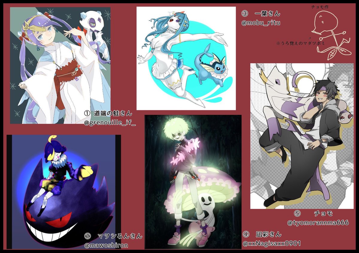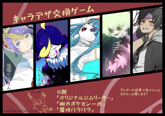 #誰のキャラデザだゲーム 参加させて頂きました! オリジナルジムリーダーのデザインを交換しました。私のデザインはどれでしょう。 私は②デザインの作画を担当してます。アンケートはリプに繋げております