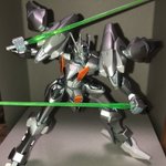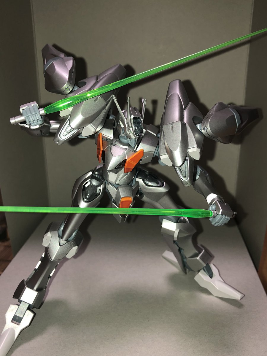 この前塗ったガンダムエアリアル3号機(仮)、追加武装を模索中… とりま手近にあったダブルリベイクライフルを装着してみたけど、エアリアル自身がガタイ良いスタイルだからあんまり似合ってないかな😅 #ガンプラ