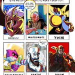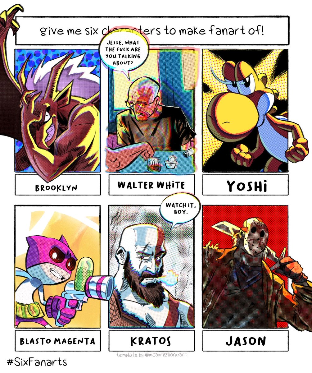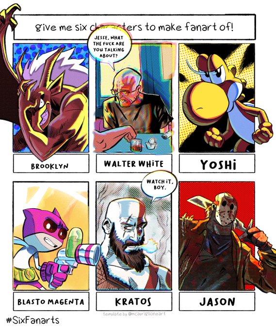 My 1st of 2 sets of #sixfanarts ! We got Brooklyn, Walter White, Yoshi, Blasto Magenta, Kratos, and Jason! Anime/manga set coming soon 👀