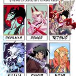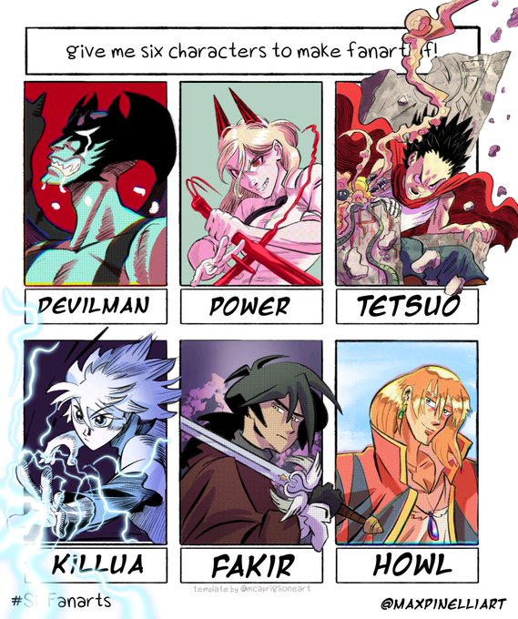 Anime / Manga themed #sixfanarts starring Devilman, Power from Chainsawman, Tetsuo from Akira, Killua from Hunter x Hunter, Fakir from Princess Tutu, and Howl from Howl's Moving Castle !