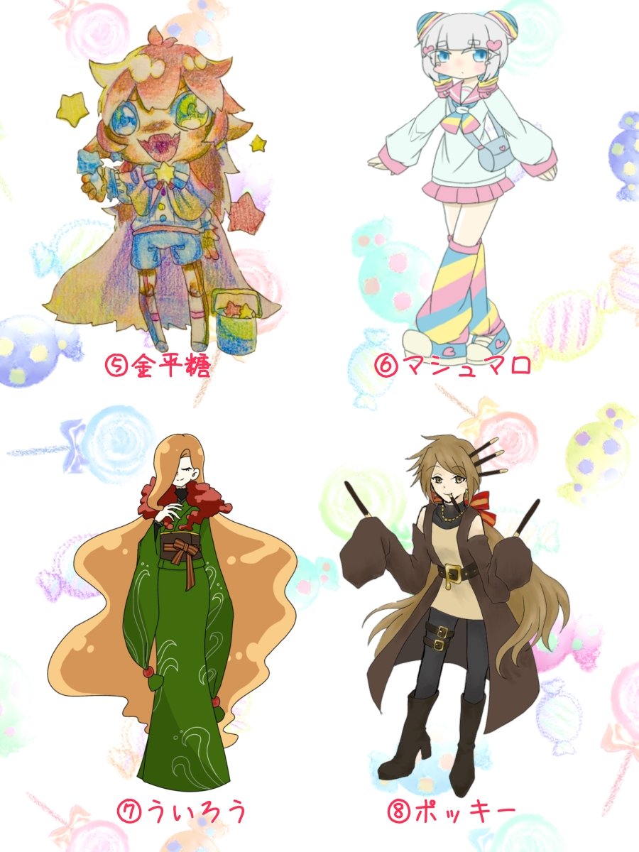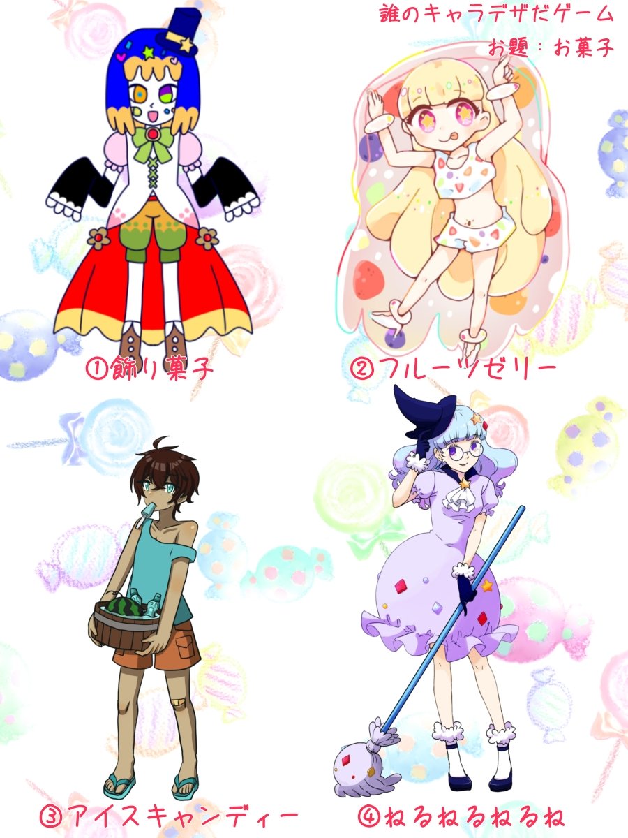 #誰のキャラデザだゲーム 主催を担当しました!お題はお菓子! うちは①の飾り菓子の子を描きました! ツリーにアンケートをつけるのでどれがうちが担当したキャラデザか当ててみてください!!