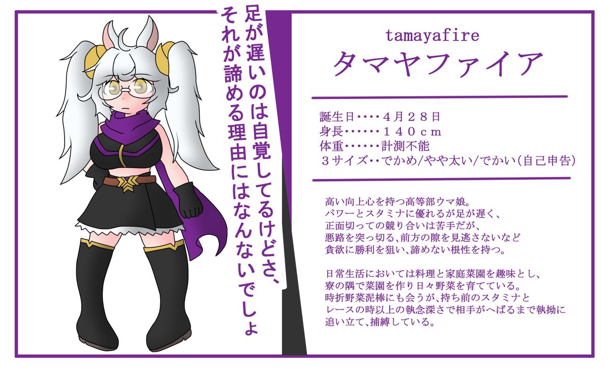 @guignol_l @shiyou_PSO2 @rakugaki_frog @Shinnokokera @itigodihuku_kai @Fe_sabituki @gomakinako_ できました! 多分脚質的には追い込み型 #フォロワーさんからイメージもらって自分をウマ娘化する