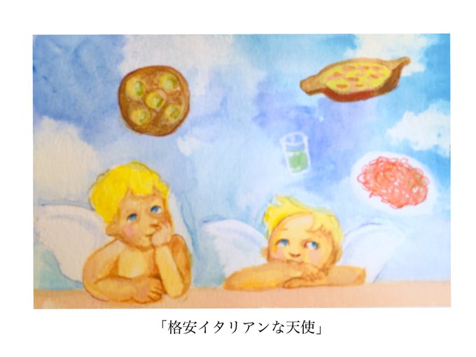 2 18 タイトル【格安イタリアンな天使】 「やすいよなー」「プチフォッカもいっとく?」 #みんなで楽しむTwitter展覧会 #今月描いた絵を晒そう #水彩画 #絵描きさんと繋がたい 21/12/01 09:23