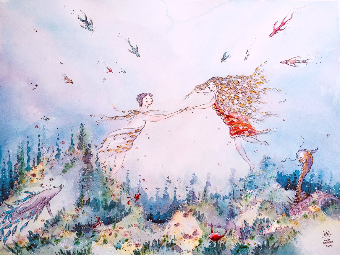 Peinture art contemporain "Le vœu de la nymphe", principalement acrylique, aquarelle et pastels à l'huile, 40 x 60 cm / 16x24 in. #art #painting #artforsale #mythicalcreature #nymph #fantasyart #digitalpainting
