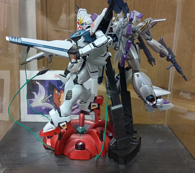 F91(チタニウムフィニッシュ)完成したので、ビギナ・ギナ(エクストラフィニッシュ)と台座のラフレシアと飾ります。(富野展のポストカードも添えて) #ガンプラ #大戦模型部 #ガンプラの画像を貼るとRTされると聞いて