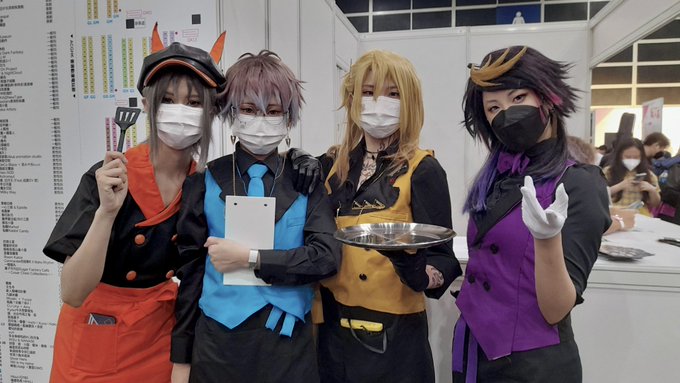 #ACGHK2022 Luxiem- cafe version 🧡mysta @AErenSH817 💙Ike me 💛Luca @itaita_Zadkiel 💜Shu @CherryyCat All the clothes are made by ourselves again 🙈 We also met shu at the event so we got this photo! #Luxiem #Ikenography #MystArt #drawLuca #cospleyy #cosplay