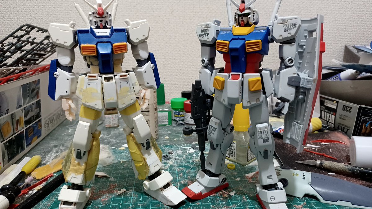 本日の作業 ジムに本サフを吹く 同じフォーマットで造ったガンダムとアレックスとの比較 相変わらずドコ弄ったってレベルですね〜 今週末には完成させたいです。 #ガンプラ #ガンプラの画像貼るとRTされると聞いて #今月完成しなかったプラモ晒そうぜ
