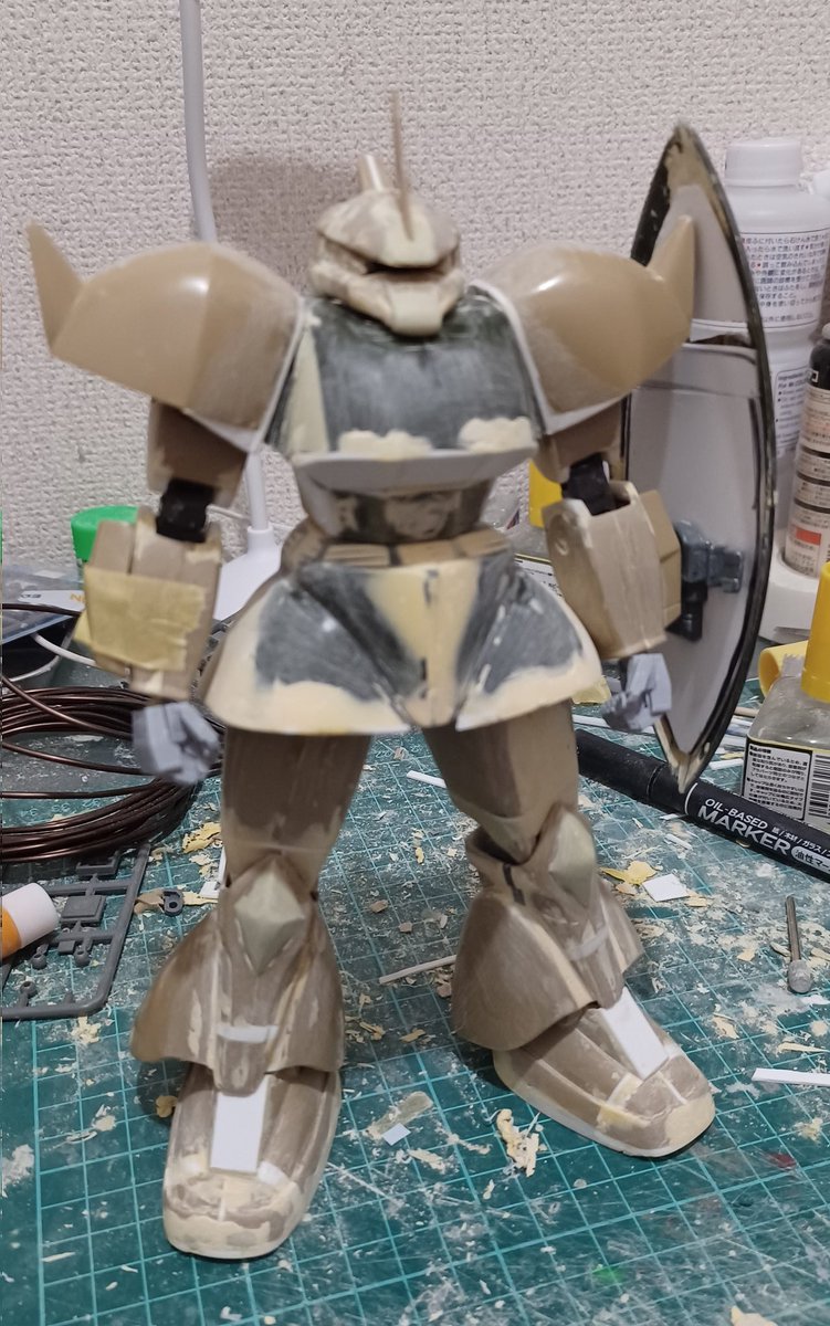 本日の作業 とりあえず肩まわりを造る。肩後方のプロペラントタンクは100均で買った携帯用の消毒スプレーのボトルを加工してみました。胸のダクトとか付けるとだいぶツヴァイ感が出てきた? #ガンプラの画像を貼るとRTされると聞いて