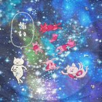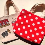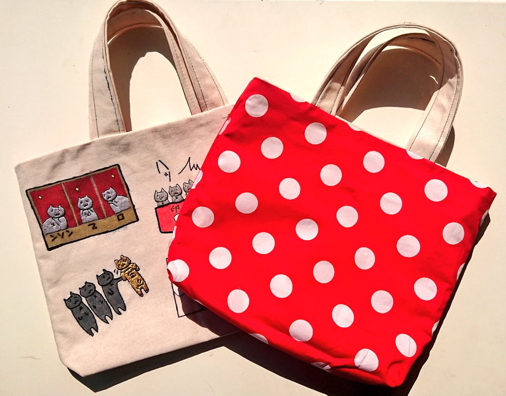 19 50 その1:全体図(裏地はベニテングタケ柄) ←左:キャッツとの思い出トート →右:物心ついたにゃトート #関羽祭 #トートバック #刺繍 #アクリル絵の具 #リクエスト刺繍 21/04/25 14:51