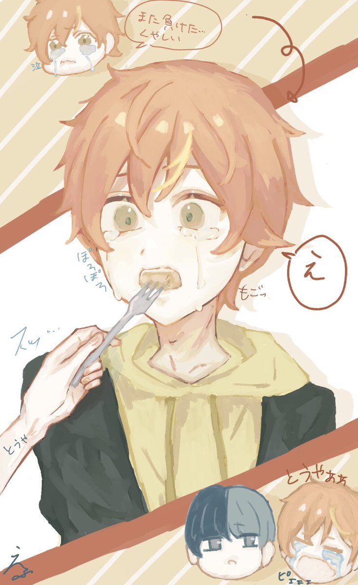 12 106 上手く歌えなくて凹んで泣いてる(キャラ崩壊)彰人に冬弥がパンケーキ食べさせて慰めてる状況です。 #prsk_FA #絵描きさんと繋がりたい #東雲彰人 #絵柄が好みって人にフォローされたい 22/01/29 10:01