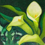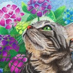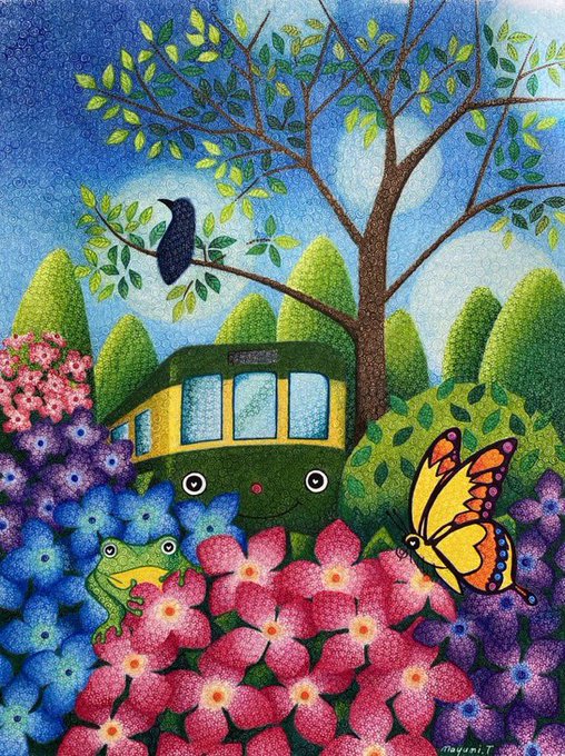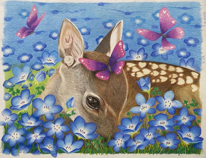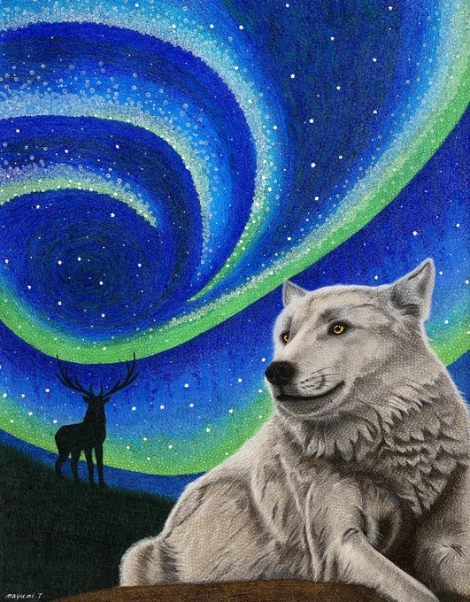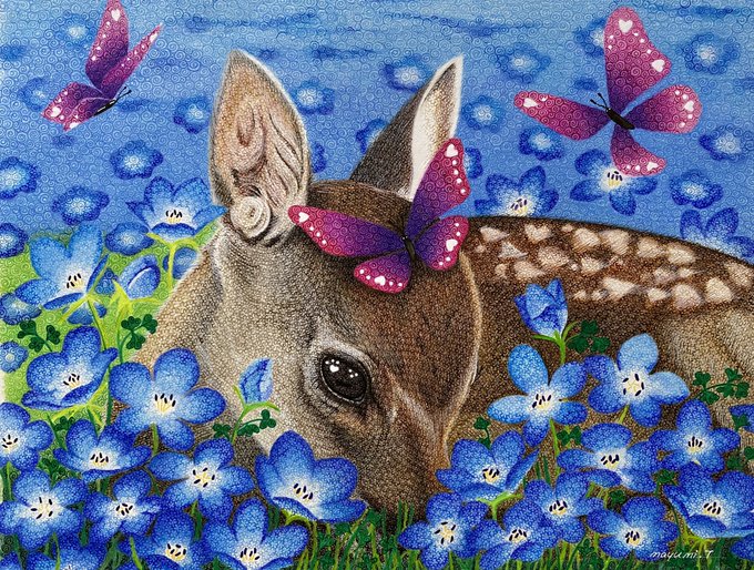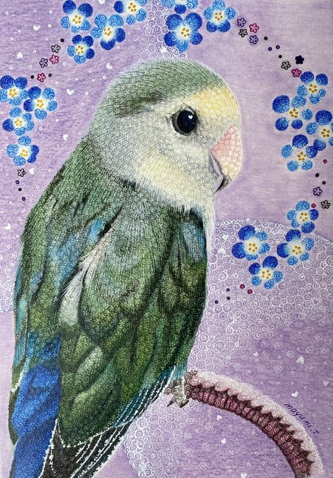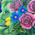 画像を拡大してご覧ください😊 ガラスペンとカラーインクて点描画のように花模様と渦巻き模様をひと描きひと描き 動物や植物を描いています 画像は色鉛筆での下塗りと 完成作品 #Twitter文化祭2022