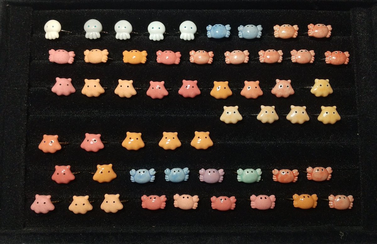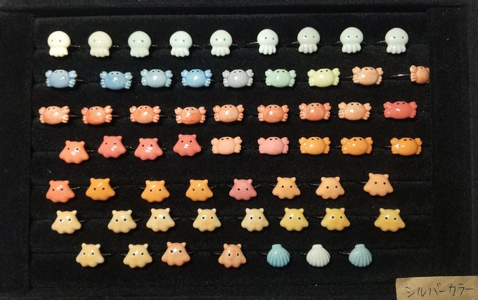 【デザフェス57 販売作品14】 ◆カニリング ◆メンダコリング ◆くらげリング ◆貝殻リング ◆ひよこリング🆕 →陶器の指輪🦀 金具はゴールドとシルバーの2色、調整可能なフリーサイズリングとなっております💍 #デザフェス57 #デザフェスお品書き