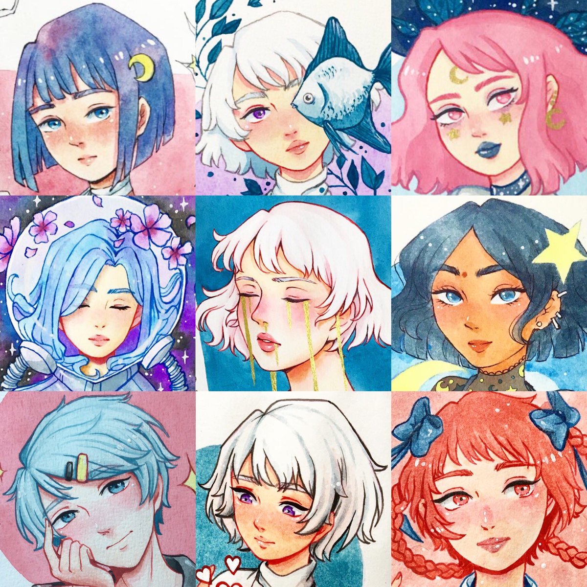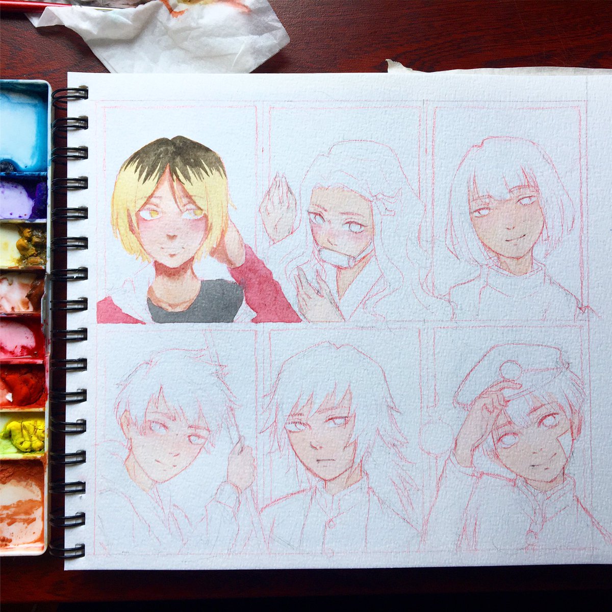 #SixFanarts wip!! Got these suggestions on ig. Can you name all of them from the sketch? 😉 #watercolorpainting #SixFanartsChallenge #gouachepainting #animepainting #animedrawing #animefanart #WorkinProgress
