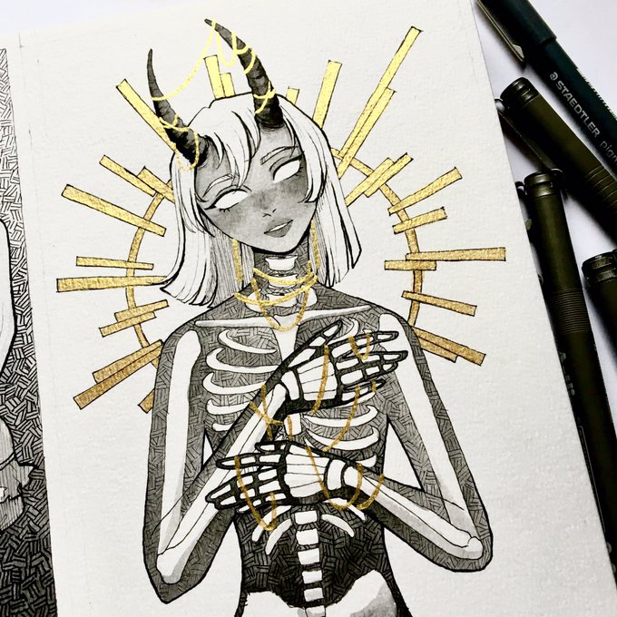 Day 2 : Skeleton I’m really loving this b&w golden combo 😍😍 On a side note thank you for 100 followers 😭😭❤️❤️❤️✨✨ #inktober #inktober2020 #drawtober #pinktober2020 #InkDrawing