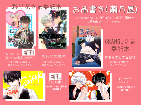 8/20SUPER COMIC CITY関西のお品書きです。 和花ちゃん(@waka_gntm)とサクラマスさん(@Sakuramasu_jpn)のご本を委託しております。 和花ちゃんは会場にも遊びに来てくれます🎉 サクラマスさんはWeb無配を当日用意してくれてるそうなのでまた案内頂けると思います🙏💕 どうぞよろしくお願い致します。