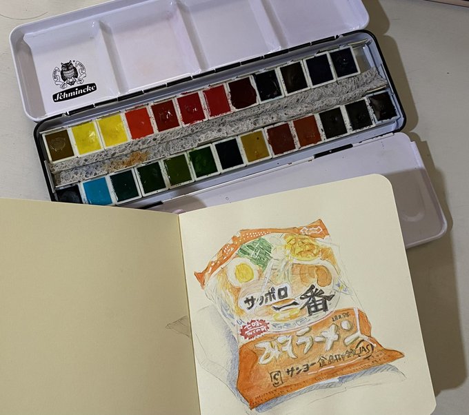 26 103 なんて素敵なハッシュタグ…!わたしのシュミンケの無駄づかい見て〜 パレットの真ん中に吸水スポンジ詰めてます🧽 #水彩発掘隊 twitter.com/bplodeo/status… 23/04/22 14:11