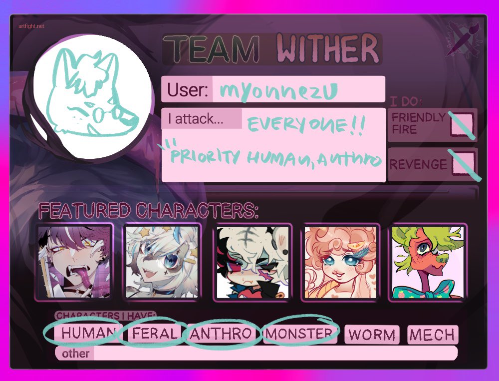 #artfight2022 Link >> artfight.net/~myonnezu พ เพิ่งเคยลงอาร์ตไฟท์ครั้งแรก แบบ ลงแบบโซโล่เลยกี๊ด เพราะอยากฝึกวาดรูปด้วยโดยเฉพาะพวกเฟอรี่ แต่ไม่มีอะไรมากระตุ้นเลย จัดทีมแบบผสมๆ จริงๆ ในนั้นมีอีกหลายคนที่เอามาลงล่ะนะะ กี๊ด เลือกตัวที่ชอบๆ มา✨