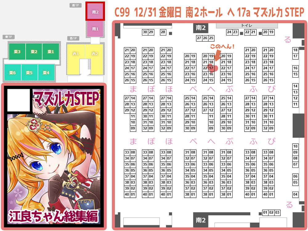 えー、確認したところC99スペース頂けてましたので頑張ろうと思います! あなたのサークル「マズルカSTEP」は、コミックマーケット99で「金曜日南地区 "へ " 17a」に配置されました!コミケWebカタログにてスペース配置場所公開中です! webcatalog.circle.ms/Circle/Map/157… #C99WebCatalog