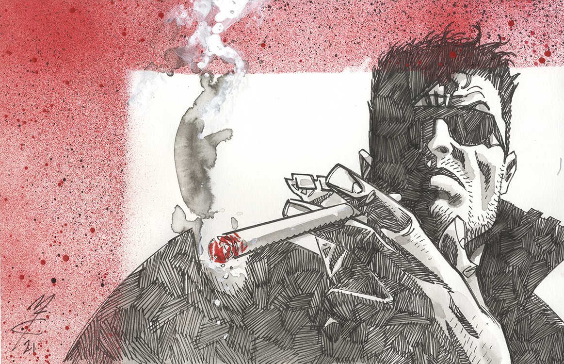 Judge Hershey inks finished.... as you can see, I added in Fink's pizen stick...completely forgot to ink Ratty 😅my memory is pretty poor these days. Poor Ratty. #2000ad #comics #comicart #ComicArtist #comicartwork #JudgeDredd @2000AD