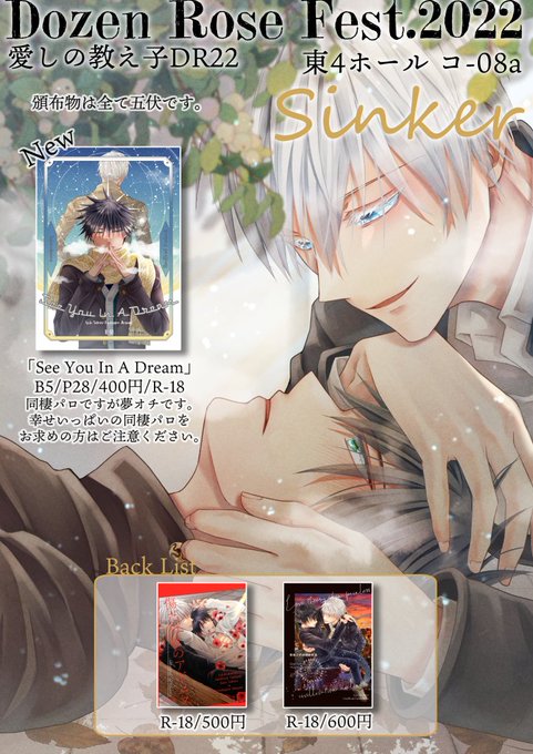 12/11 Dozen Rose Fes.2022 愛しの教え子DR2022お品書き(頒布物は全て五伏) 通販→ec.toranoana.jp/joshi_r/ec/cot… 新刊詳細→pixiv.net/artworks/10303… お品書きにない既刊をイベントでお求めの方はお手数ですがDMにてご連絡下さい。