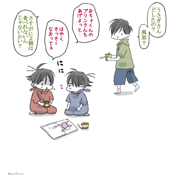 先日のうさちゃんお怪我事件の反省にしばらく安静をいいつけられたうさちゃんと年齢操作お兄ちゃんと次男ちゃんととんちんかんコメするチョロ氏