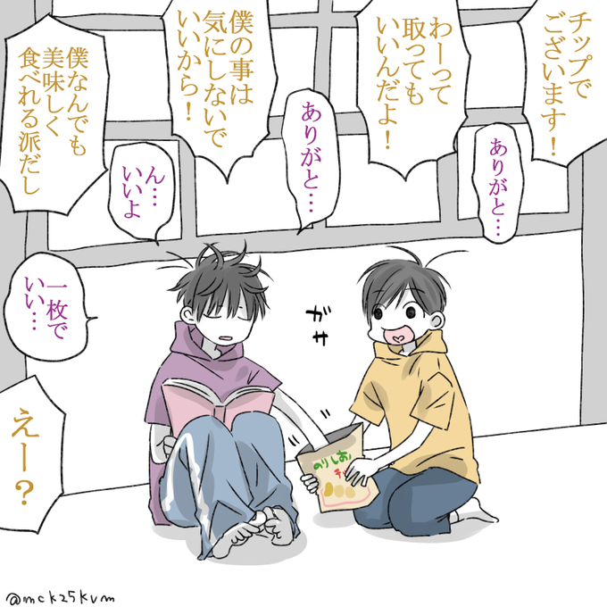 67 370 リクでいただいた仲良しパーカー松ちゃんです。 お兄ちゃんは無意識に人をだめにするタイプで、いちまっちゃんはわかっててそれに乗るタイプではなかろうかって話です。 23/08/14 06:13
