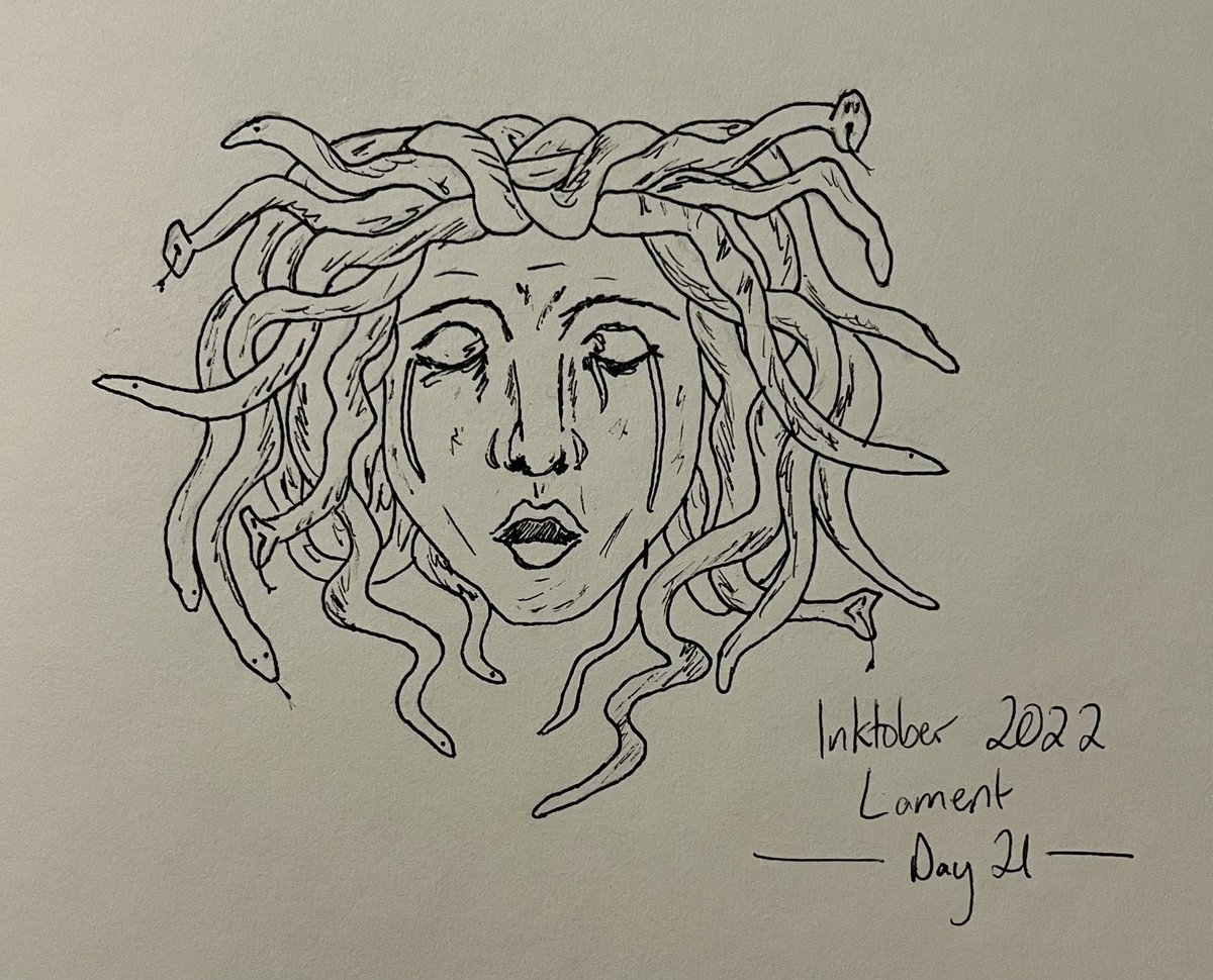 How miserable it would be. To be so pretty that a god forces himself on you and then the goddess you’ve devoted your life to, curses you to become a monster #inktober2022 #inktoberday21