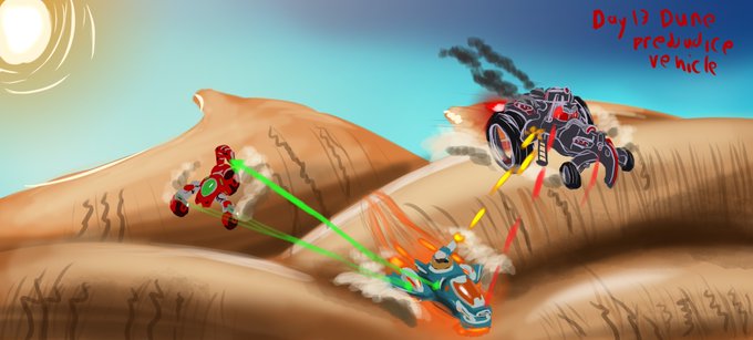 mechademik Inktober day 13 Dune Prejudice Vehicle, I decided to do a mad Max style desert chase. #mechademik #chloebellaw #inktober2020 #inktoberdune #inktoberday13 #inktober #dune #sanddunes #desert #race #gun #battle #carbattle #art