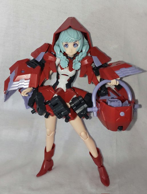 改めてメガミデバイス赤ずきん。ケープ周りが気になっていたので全体が上になるようジョイントを背中から後頭部に接続へ変更。またケープの前2枚をスカート用の短いジョイントに変更して密度を高めにしてみました #メガミデバイス
